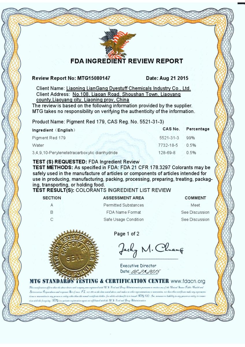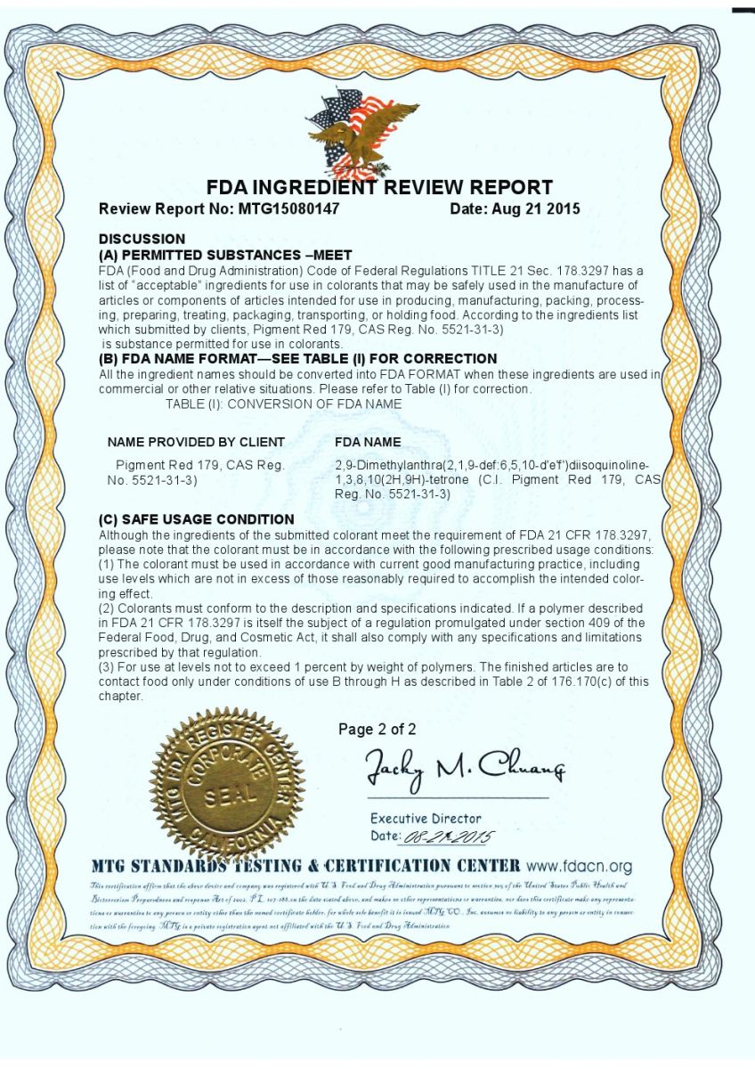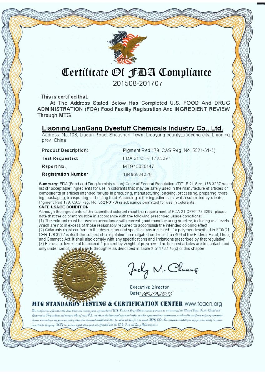 為了進一步拓展我司產品顏料紅179(PIGMENT RED 179, S-4180)的應用領域,同時應廣大客戶要求,我司已將顏料紅179做了美國FDA(FDA 21 CFR 178.3297)的檢測和認證,注冊號為18486824328,證書號為MTG15080147。檢測結果顯示我司產品顏料紅179完全符合FDA的認證標準。這項權威的認證結果表明我司所生產的的顏料紅179完全可適用于食品接觸(塑料包裝、薄膜及纖維拉絲等)領域。