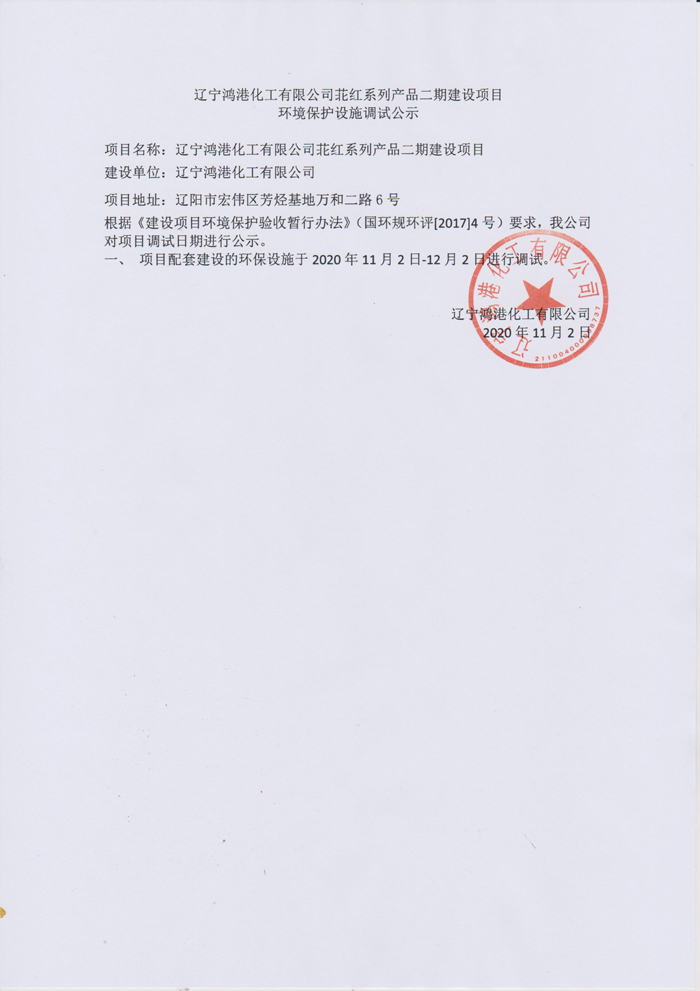 遼寧鴻港化工有限公司苝紅系列產(chǎn)品二期建設項目 環(huán)境保護設施調(diào)試公示